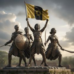 FUN FACTS ABOUT EZAEKIA AND ITS RIVALThe Charryzavesh National Capital Regional Flag (formally known as the Ghervatic flag or the Muheyai flag), is Ezaekia's capital regional flag. It has a golden triangle design within the triangle black field, which represents Ghervatic lineage. Inside the triangle design is another triangle that Ghervatics depict as a lunar eclipse, a phenomenon they believe personifies both God's voice and His divine intervention. The CNCR's flag is often flown with the nation's flag during ceremonies, war, special events, and occasions. The gold colors represent honor, dignity, leadership, and freedom from all temptations. The black represents war, the wrath of God and his people, and a warning to enemies. The 3 stars represent peace, purity, righteousness, glory, salvation, and the Holy Trinity.